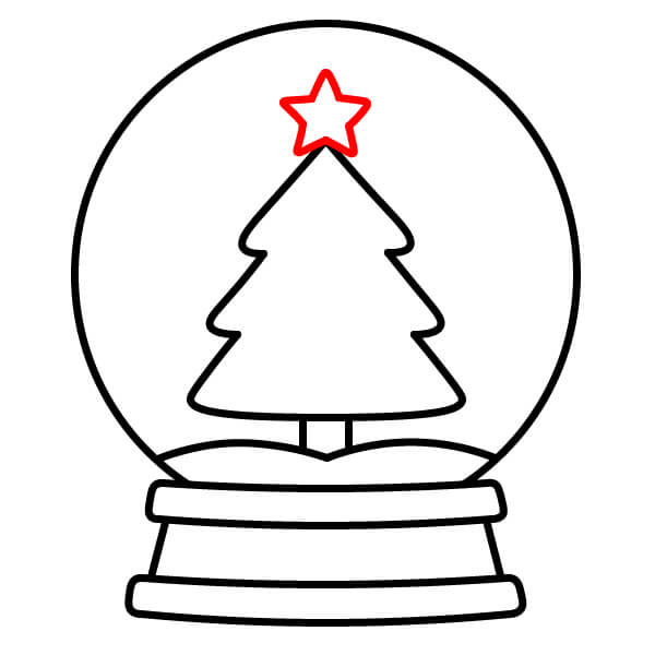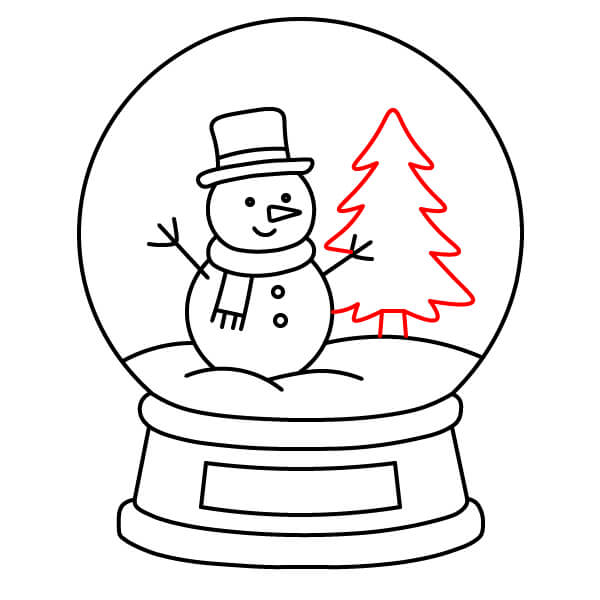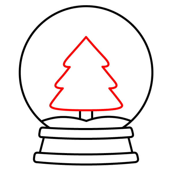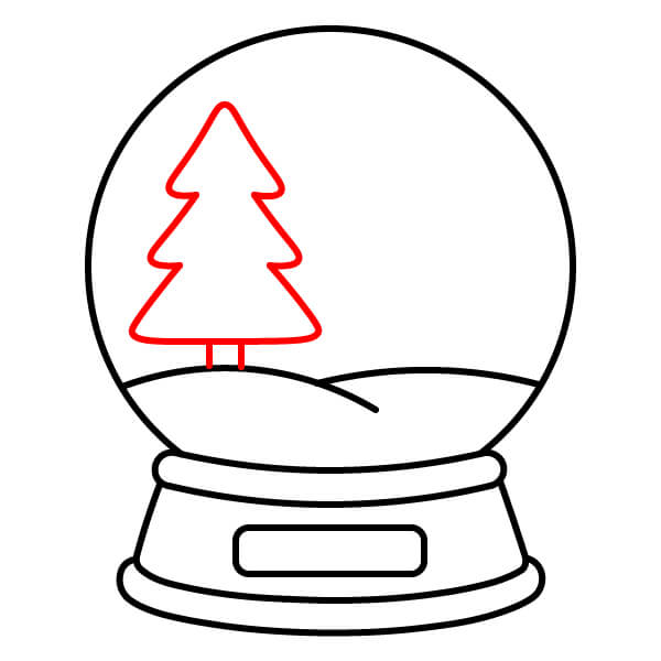 Étape 8 : Dessinez une forme triangulaire à plusieurs niveaux sur le côté droit du globe pour le sapin de Noël. Ajoutez un petit rectangle vertical en dessous pour le tronc, posé sur le monticule de neige.