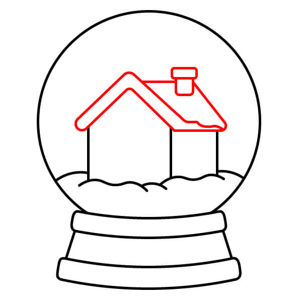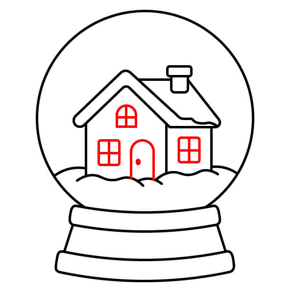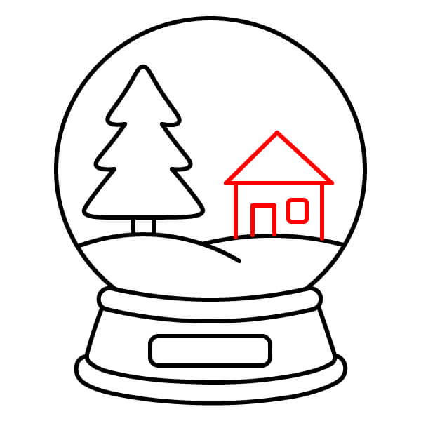 Étape 8 : Dessinez une maison simple sur la droite du globe, derrière le monticule de neige. Elle doit avoir des murs droits, un toit triangulaire, une porte et une fenêtre.