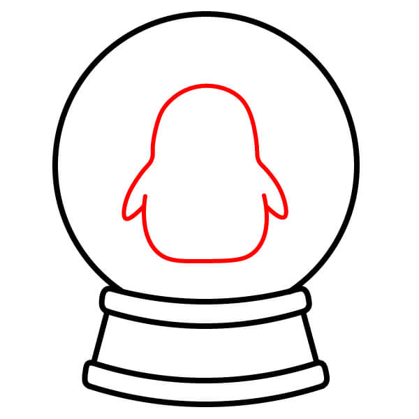 Étape 4 : À l’intérieur du globe, dessinez une forme allongée et arrondie pour le corps du pingouin, avec deux petites ailes/nageoires incurvées qui dépassent sur les côtés.