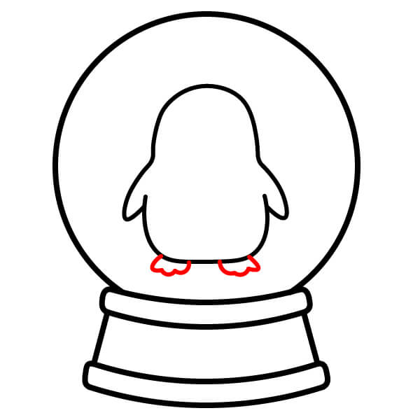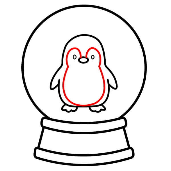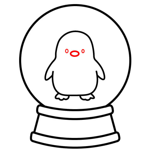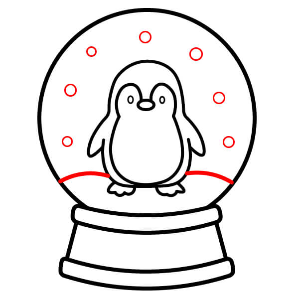 Étape 8 : Tracez une ligne ondulée à la base du globe, juste en dessous des pattes du pingouin, pour représenter un monticule de neige. Dessinez plusieurs petits cercles dispersés à l’intérieur du globe pour représenter des flocons de neige.