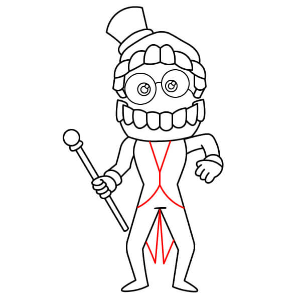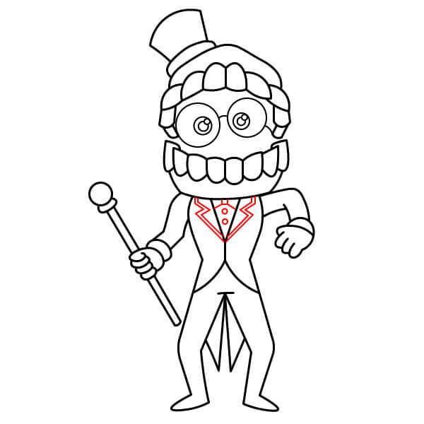 Ajoutez les derniers détails au corps de Caine pour évoquer sa tenue de cérémonie. Dessinez les revers et des lignes sur le torse pour créer la forme du gilet et de la veste. Utilisez des lignes droites et angulaires pour suggérer une fente à l’arrière de la veste.