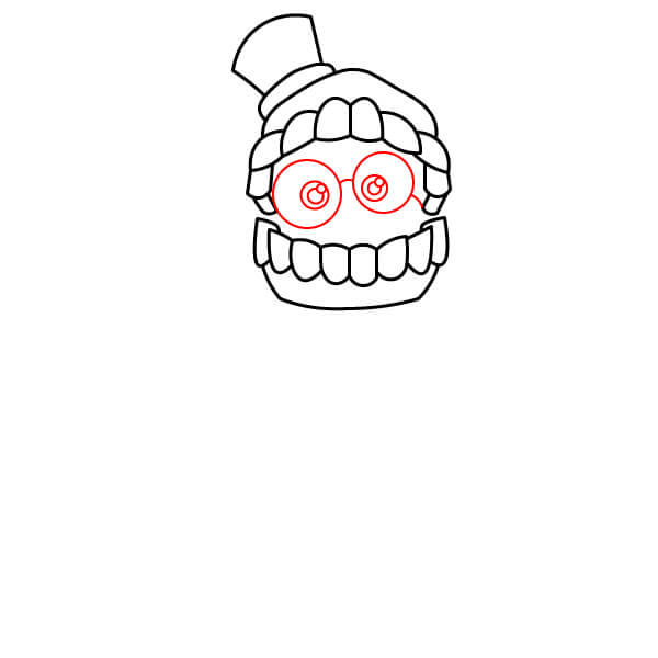 À l’intérieur de l’espace formé par les dents, dessinez deux grandes lunettes circulaires avec un pont. À l’intérieur de chaque lunette, dessinez un cercle plus petit pour les yeux, en veillant à ce qu’ils paraissent grands et un peu grotesques.