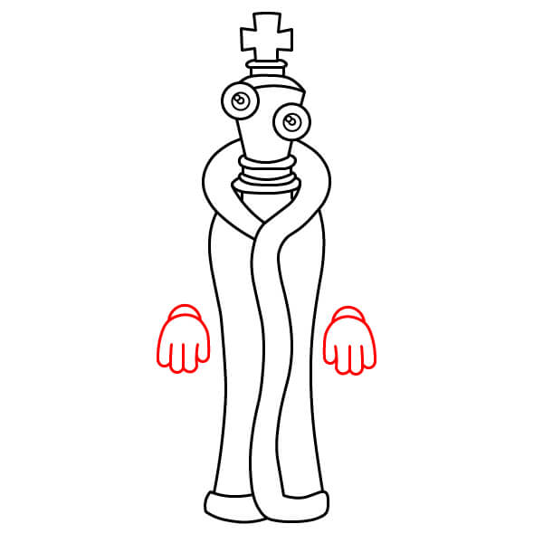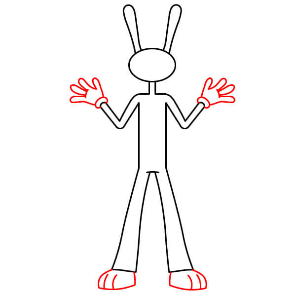 Dessinez deux mains grandes et ouvertes, portant des gants (indiqués par le contour des poignets). Dessinez deux grands pieds ronds et ajoutez un trait près du haut des pieds pour suggérer le bas du pantalon/des chaussettes.
