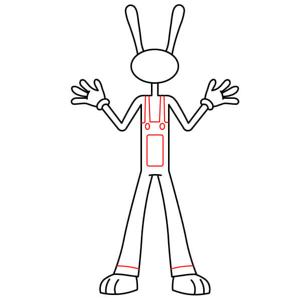 Dessinez les détails de la salopette de Jax sur le torse. Ajoutez deux bretelles partant des coins supérieurs et descendant le long de la bavette, et dessinez une poche carrée/rectangulaire au milieu de celle-ci. Ajoutez de petits cercles pour les boutons auxquels les bretelles sont attachées.