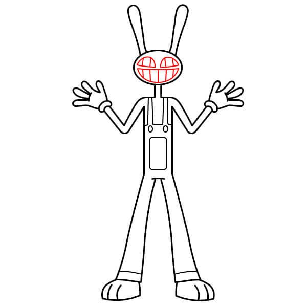 Dessinez le sourire malicieux de Jax ! Tracez une longue courbe large dans la moitié inférieure de sa tête pour former la bouche. Remplissez cette zone avec de grandes dents carrées et deux petits traits à l’intérieur de la bouche pour définir les gencives.