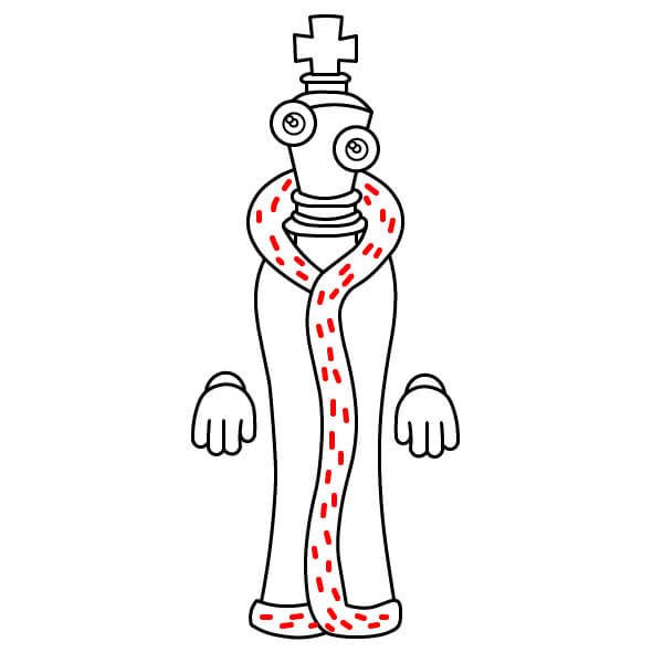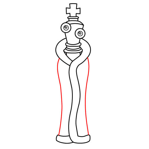 Sous le corps spiralé, dessinez deux jambes en ruban. Ce doivent être de longs rubans incurvés, semblables aux bras, se terminant par de simples pieds ronds. Ils sont fixés à la base du corps spiralé.