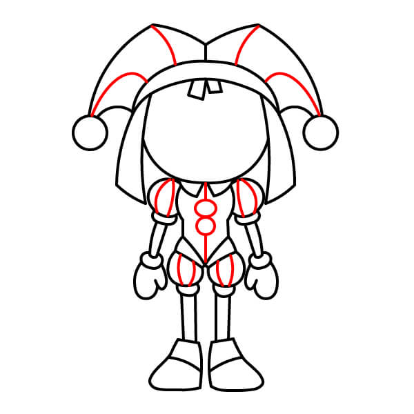 Tracez une ligne verticale au milieu du torse. Dessinez deux petits cercles au milieu pour représenter les boutons/fermetures. Ajoutez des courbes au rabat du chapeau de clown, créant un effet bicolore. Ajoutez des courbes verticales aux manches bouffantes et au pantalon pour définir les différentes parties de couleur.