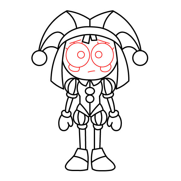 Ajoutez les derniers détails au visage de Pomni : dessinez de grands yeux tristes aux pupilles étroites et une bouche simple, légèrement froncée. Ajoutez des sourcils et une touche de blush sous chaque œil.