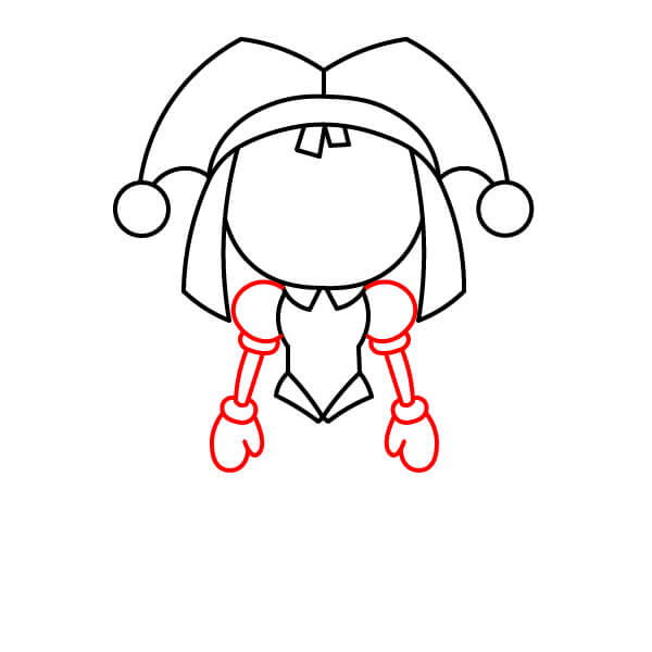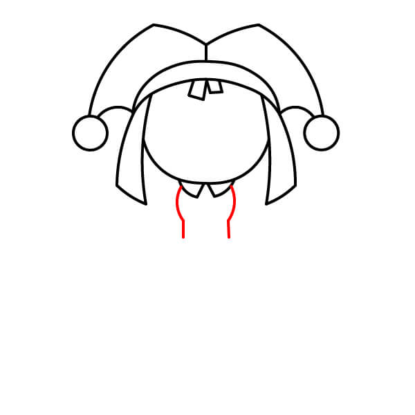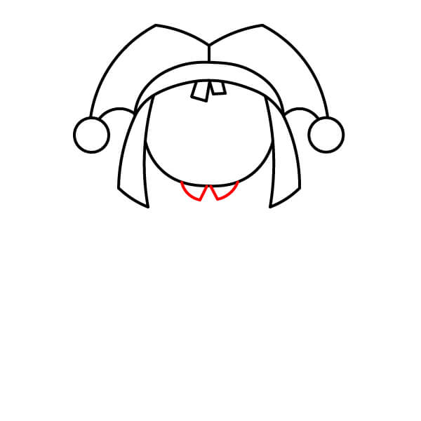 Dessinez un grand ovale à l’intérieur du chapeau pour la tête de Pomni. Ajoutez les rabats latéraux (ressemblant à deux tresses) pour encadrer le visage. Dessinez également deux petites dents de devant au centre du haut de la tête.