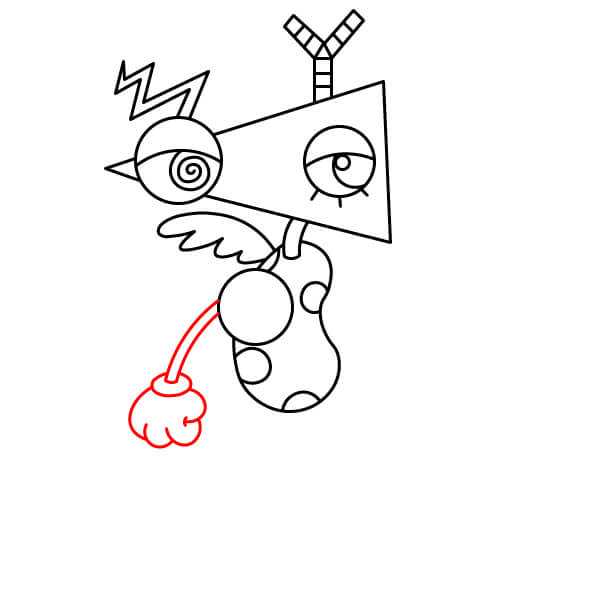 Dessinez une petite aile avec des plumes qui dépassent du côté de la tête, au-dessus du segment du corps en forme de haricot.