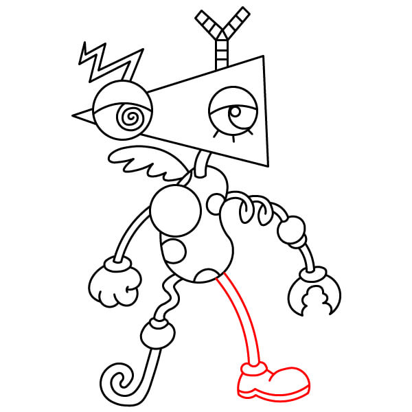 Dessinez la jambe gauche (à droite du spectateur). Cette jambe a une forme plus complexe : une forme ondulée, semblable à un ruban, qui part du bas du torse, est fixée à une articulation sphérique et se termine par un pied en spirale.
