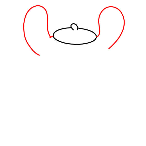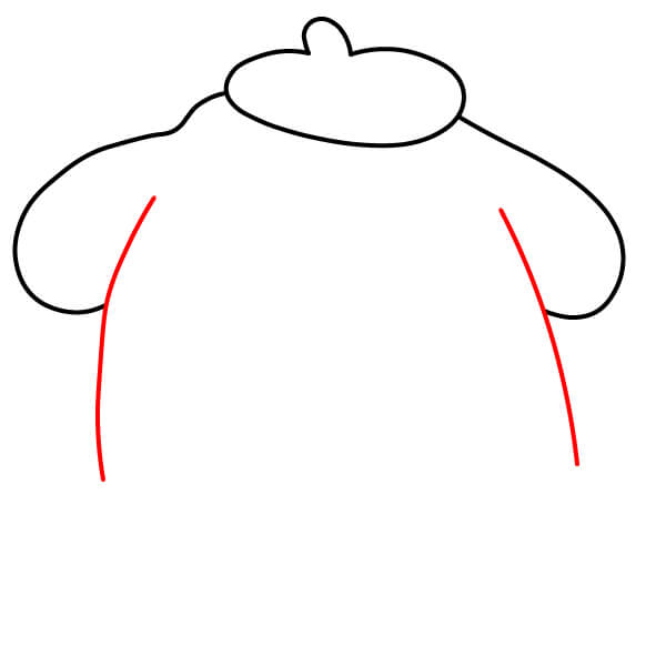 Dessinez deux longues lignes courbes descendant depuis le bas des oreilles. Elles formeront les côtés du corps rond et dodu de Pompompurin.