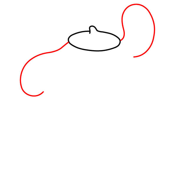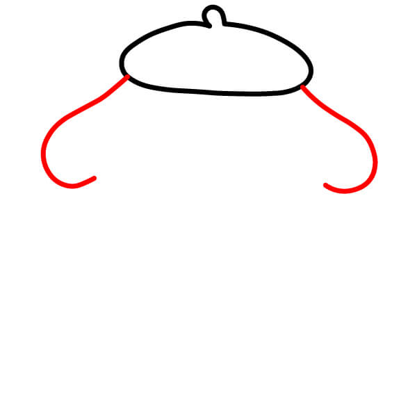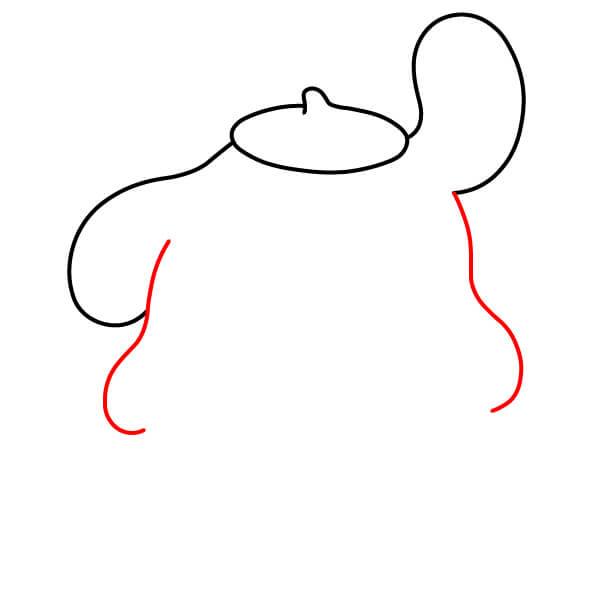 À partir des côtés du béret, dessinez deux grandes lignes courbes qui s’étendent vers l’extérieur puis reviennent vers le centre, formant les oreilles tombantes de Pompompurin.