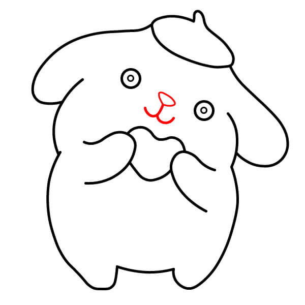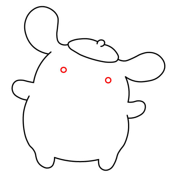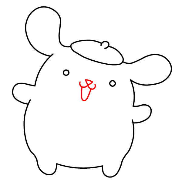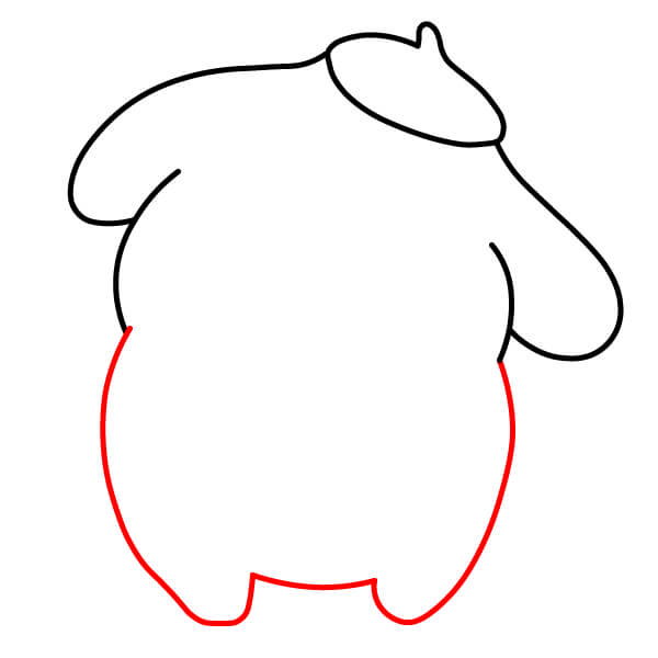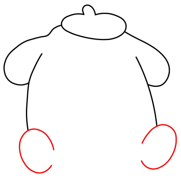 Dessinez une grande forme arrondie pour le corps de Pompompurin, reliant les lignes des bras et ajoutant deux petits pieds arrondis en bas.