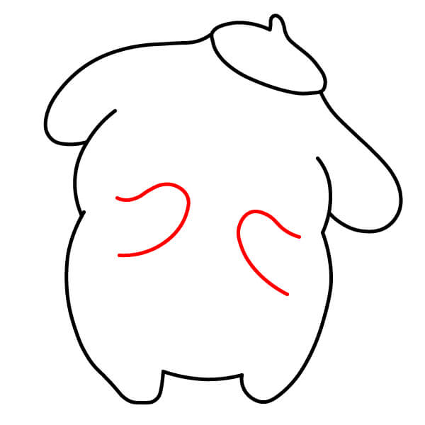 Dessinez deux lignes courbes sur le bas du devant du corps pour indiquer les pattes avant de Pompompurin reposant sur son ventre.