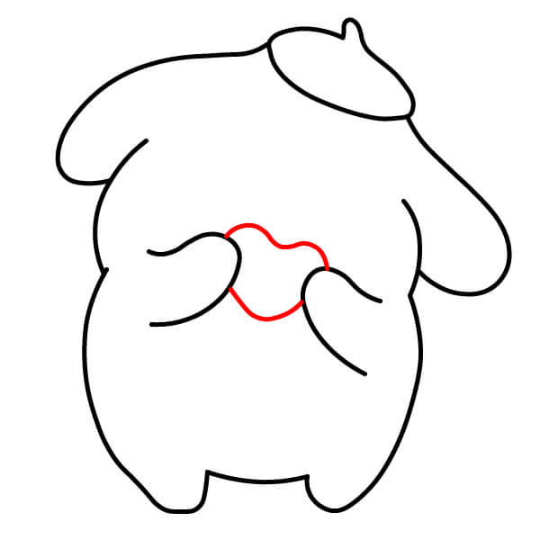 Tracez deux lignes courbes sur le devant du corps de Pompompurin pour former ses pattes prêtes à tenir quelque chose.