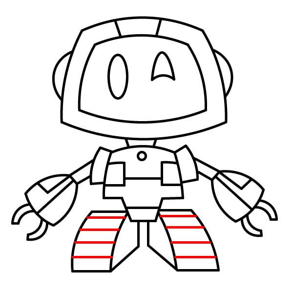 Sur chaque jambe, dessine trois lignes horizontales sur la partie la plus large pour créer l’effet de chenilles de type tank.