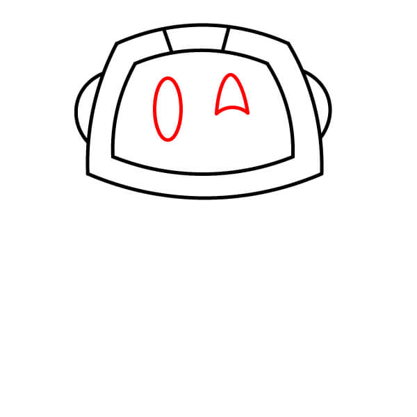 À l’intérieur de la zone de l’écran, dessine les yeux. L’œil gauche est un simple ovale vertical. L’œil droit est une forme courbe légèrement pointue, donnant l’impression d’un clin d’œil.
