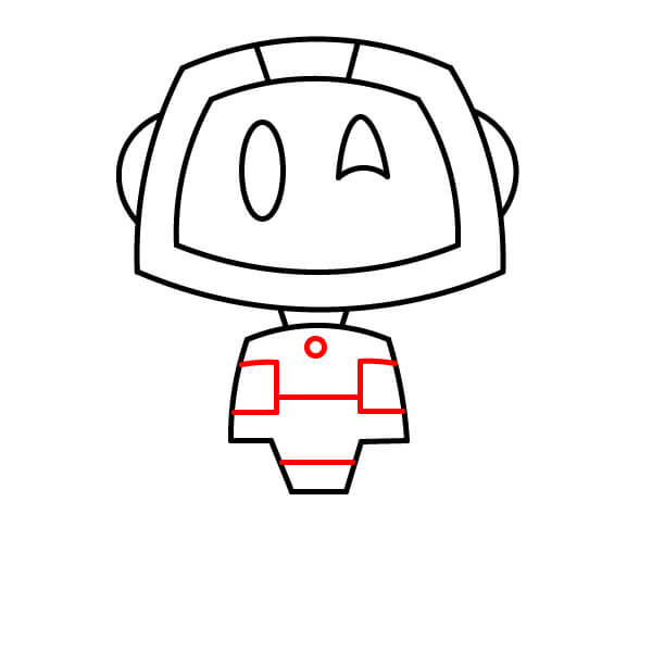 À l’intérieur du torse, trace des lignes horizontales et verticales droites pour créer des sections/panneaux. Dessine un petit cercle au centre supérieur de la poitrine.