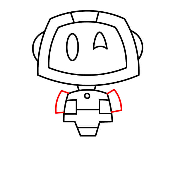 Dessine deux longues lignes fines en forme de tube partant du corps pour les bras. Ajoute des mains de forme carrée avec des doigts et un bracelet (manchette) à chaque poignet.