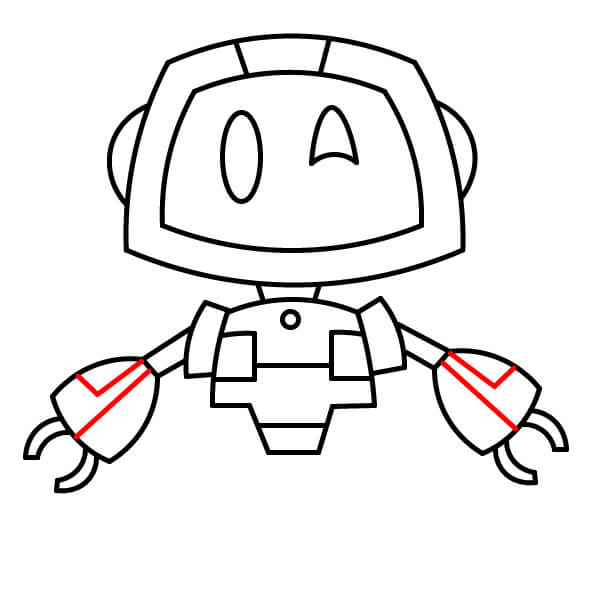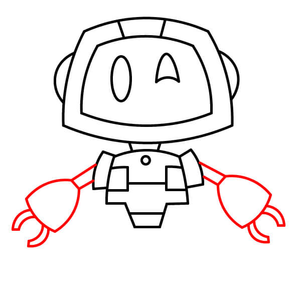 Dessine des bras fins partant des épaules. À leur extrémité, dessine de grandes mains en forme de pinces arrondies. Chaque pince comporte deux pointes courbes vers le bas.