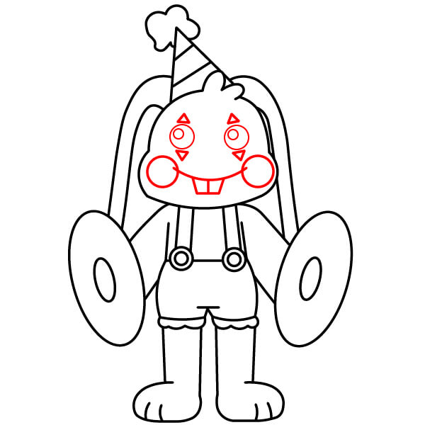 Dessine deux cercles pour le blanc des yeux. À l’intérieur, ajoute un cercle plus petit pour les pupilles. Dessine deux petites formes triangulaires au-dessus de chaque œil. Dessine deux grands cercles de chaque côté de la partie inférieure du visage. Trace une large ligne courbe reliant les joues, puis ajoute deux dents carrées en dessous. Dessine une petite ligne arrondie au-dessus de la bouche reliant les joues.