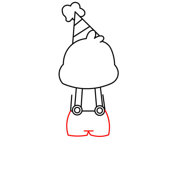Dessine une forme de cône sur la tête pour le chapeau de fête. Ajoute quelques lignes inclinées à l’intérieur du cône pour les détails. Dessine une forme regroupée, semblable à un nuage, à la pointe du cône pour le pompon.