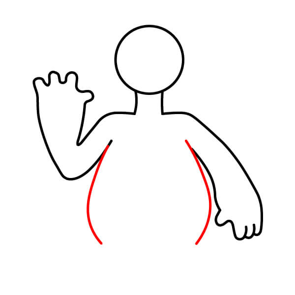 Dessine deux courtes lignes inclinées s’étendant vers l’extérieur depuis les côtés du short (là où se trouve le torse) pour commencer les bras. Dessine aussi deux courtes lignes inclinées reliant le short au contour du torse dessiné à l’étape 4.