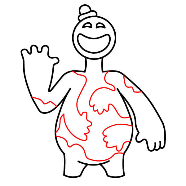 Dessine plusieurs grandes formes irrégulières et ondulées à l’intérieur du corps et des bras. Ces lignes délimitent les différentes parties de pâte colorée qui composent le corps de Doey.