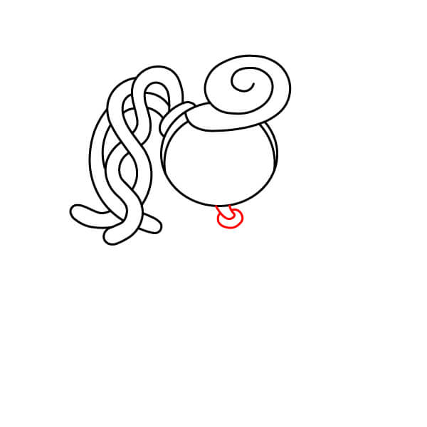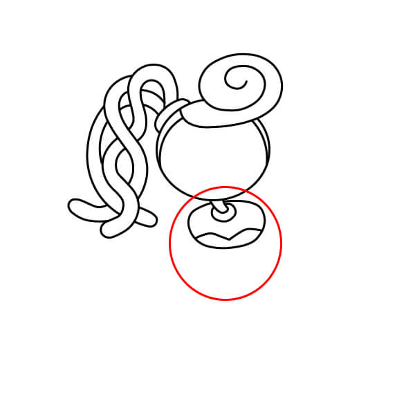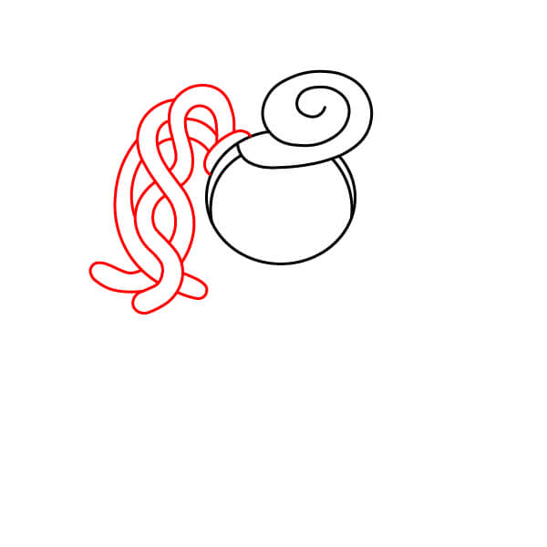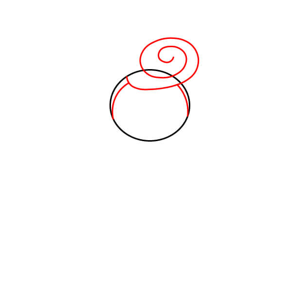 Dessine une ligne courbe au-dessus du cercle pour la ligne des cheveux, puis ajoute une grande spirale en haut à droite pour représenter son chignon ou sa queue de cheval enroulée.