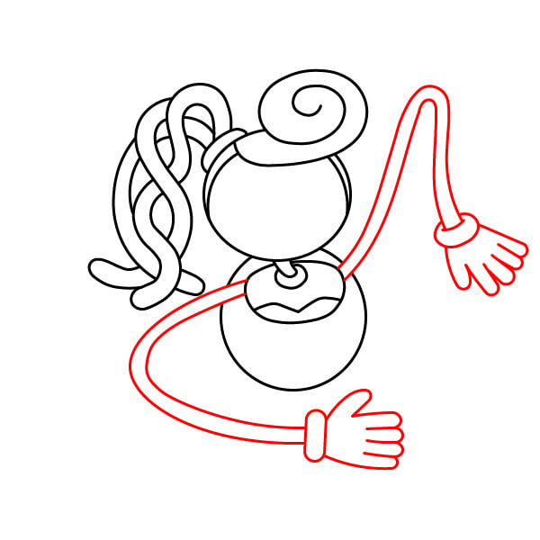 Dessine le bras gauche (du côté droit de l’image) qui s’étend vers l’extérieur et se plie vers le haut, se terminant par une main avec quatre petites bosses ondulées pour représenter la texture de la pâte. Ce bras doit donner l’impression qu’il fait un signe de la main.