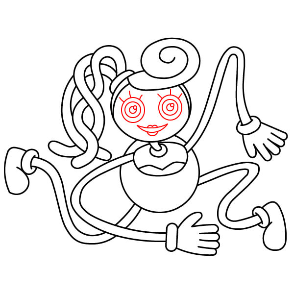 À l’intérieur de la tête, dessine deux grands cercles pour les yeux. À l’intérieur, ajoute des cercles concentriques plus petits pour les pupilles et un détail supplémentaire autour des yeux pour leur donner un aspect de poupée. Termine par une petite bouche souriante avec des lèvres.