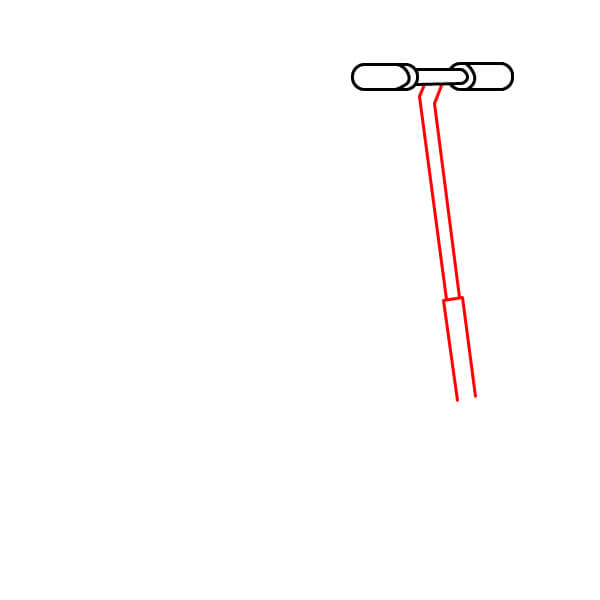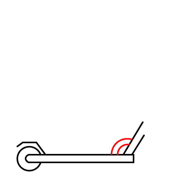 Étape 5 : À partir du bas de la potence (juste au-dessus de la fourche), tracez deux lignes diagonales parallèles descendantes et légèrement décalées vers la gauche. Elles formeront une partie du cadre principal de la trottinette.