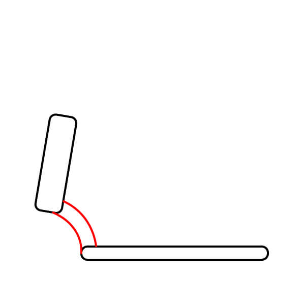 Étape 4 : Sur le côté droit du rectangle arrondi principal, tracez deux courtes lignes diagonales parallèles, orientées vers le haut et la droite. Ces lignes feront partie du mécanisme reliant la roue avant au plateau.