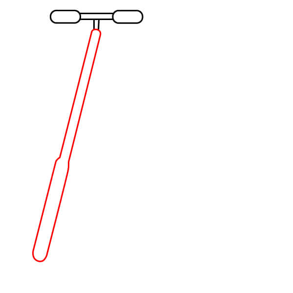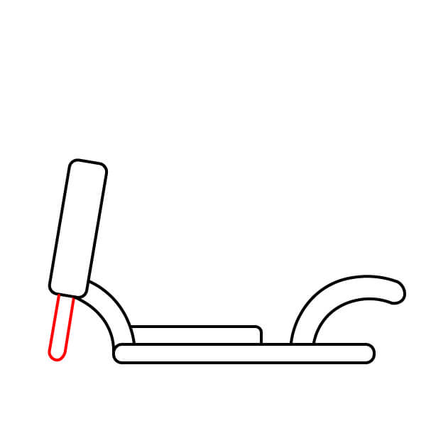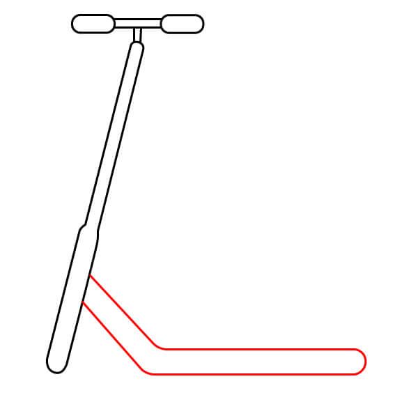 Étape 2 : Tracez une longue ligne courbe partant juste en dessous du guidon et s’étendant vers le bas et légèrement vers la droite, pour se terminer par un rectangle aplati et arrondi. Ceci forme le corps principal de la trottinette.