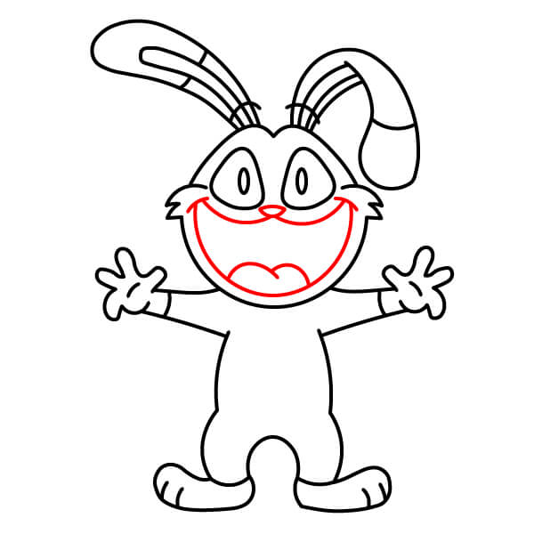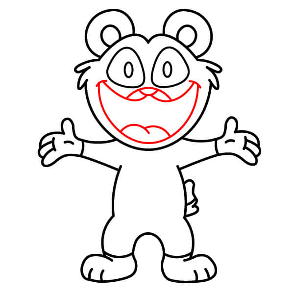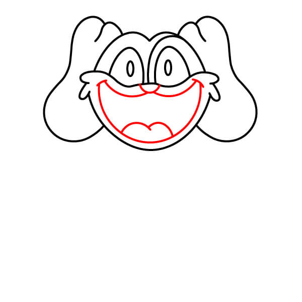 Dessinez la large bouche et l’intérieur de la bouche/langue. Tracez une grande courbe souriante à l’intérieur de la tête, s’étendant presque d’une oreille à l’autre. Ajoutez un petit “M” ou une ligne courbe au centre, en bas, pour la langue ou la lèvre inférieure.