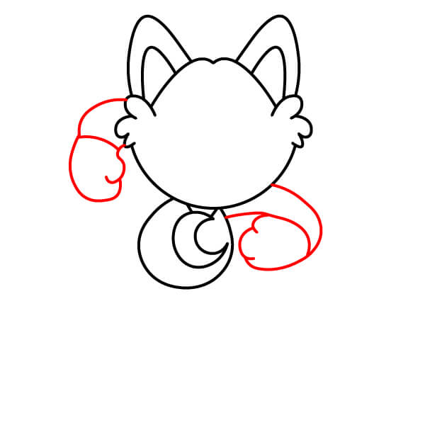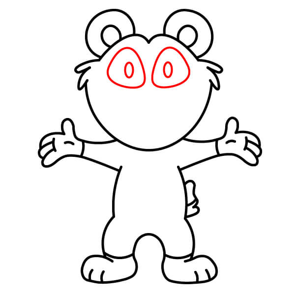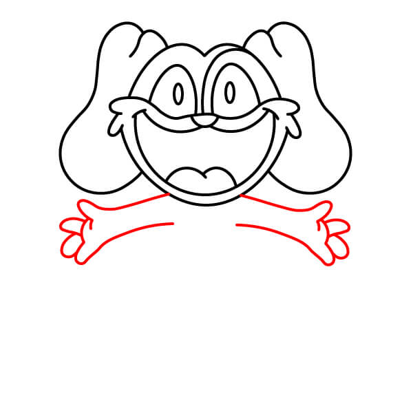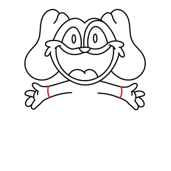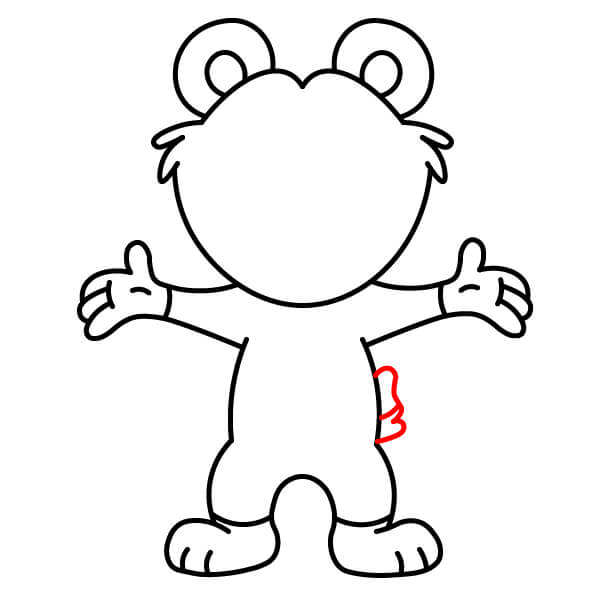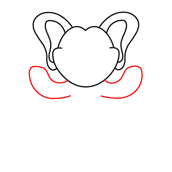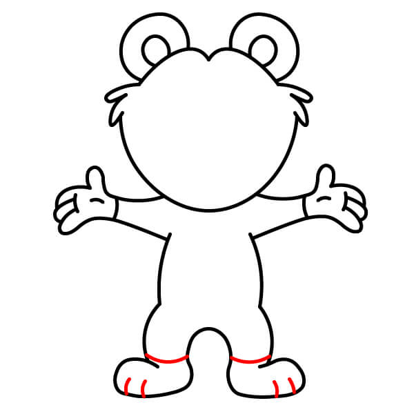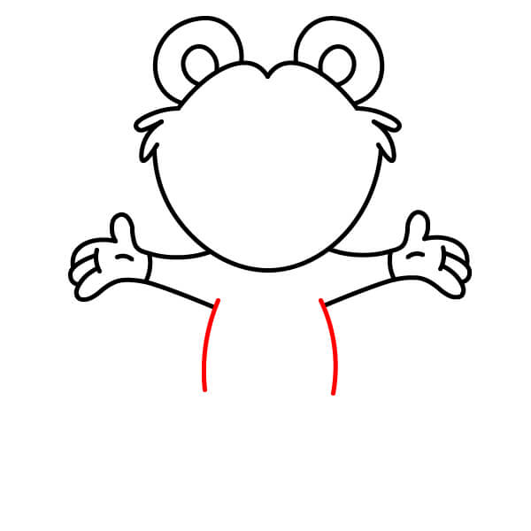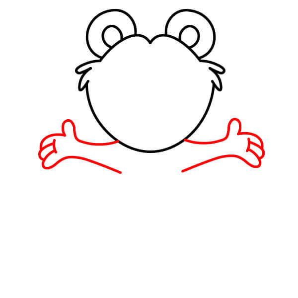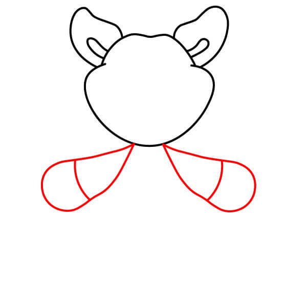 Dessinez le haut des bras. Prolongez deux lignes courbes depuis la tête et le cou et ajoutez des formes arrondies aux extrémités pour les mains et les pattes. Tracez une ligne à chaque extrémité arrondie pour définir les pattes en forme de moufles.