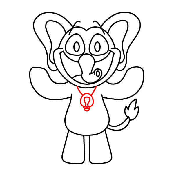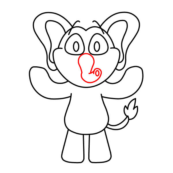 Dessinez la bouche et le sourire. Dessinez un large sourire, bouche ouverte, reliant les côtés du visage et se prolongeant sous la trompe.