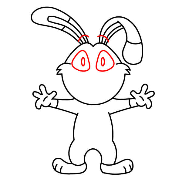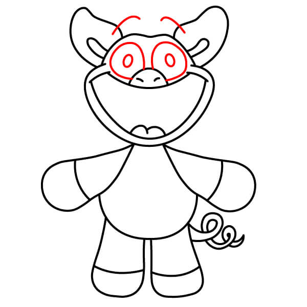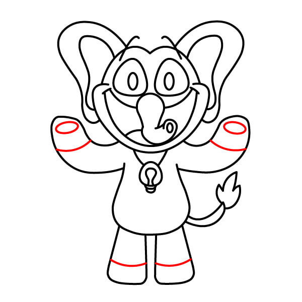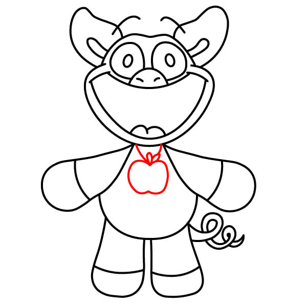 Il est temps d’ajouter de la couleur ! Coloriez le corps, la tête, les oreilles et les bras en rouge. Remplissez les yeux en noir. Coloriez l’intérieur de la bouche en rose foncé ou rouge, le ventre et le bout des mains et des pieds en rose clair, et le pendentif en forme de cœur sur la poitrine en rouge foncé ou bordeaux.