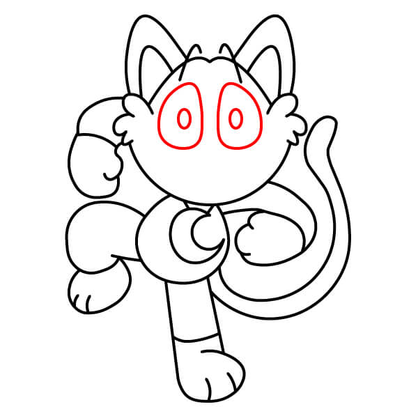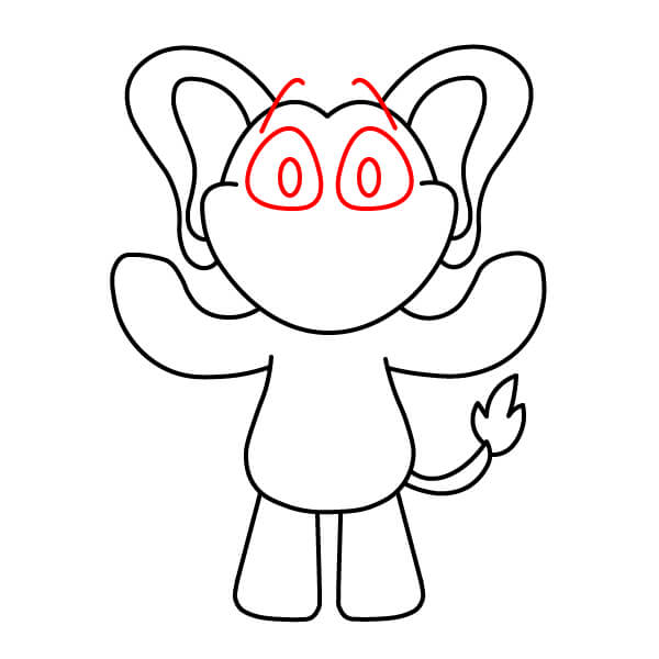 Ajoutez les yeux et les sourcils. Dessinez deux grands ovales pour les yeux à l’intérieur de la tête, et ajoutez quelques traits courts et pointus au-dessus pour la fourrure/les cheveux.