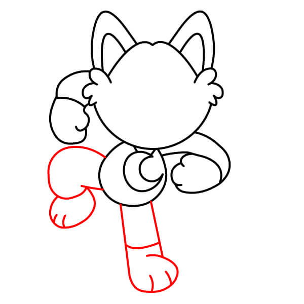 – Jambe droite (tendue) : Dessinez une ligne droite pour la jambe et une patte arrondie avec des détails pour les orteils.