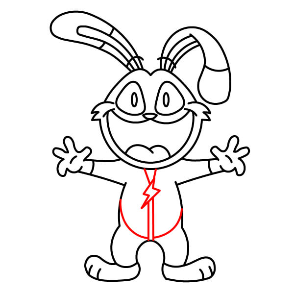 Ajoutez le pendentif en forme d’éclair et le détail de la poitrine. Tracez une ligne centrale le long du corps et ajoutez un éclair près du haut. Ensuite, dessinez deux lignes courbes sur le bas du torse pour définir le ventre.