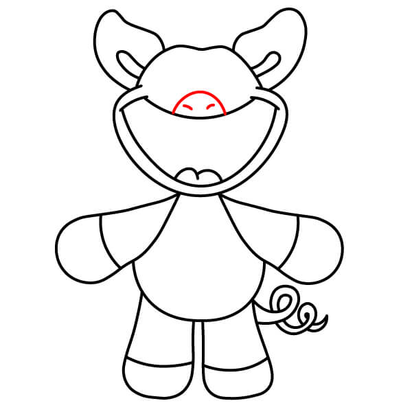 Dessinez le nez/museau et l’intérieur des narines. Esquissez une petite ligne courbe à l’intérieur de la partie supérieure de la bouche. Ajoutez deux petites lignes courbes foncées à l’intérieur de cette forme pour représenter les narines.