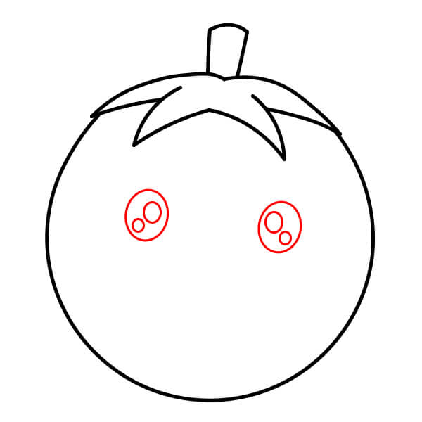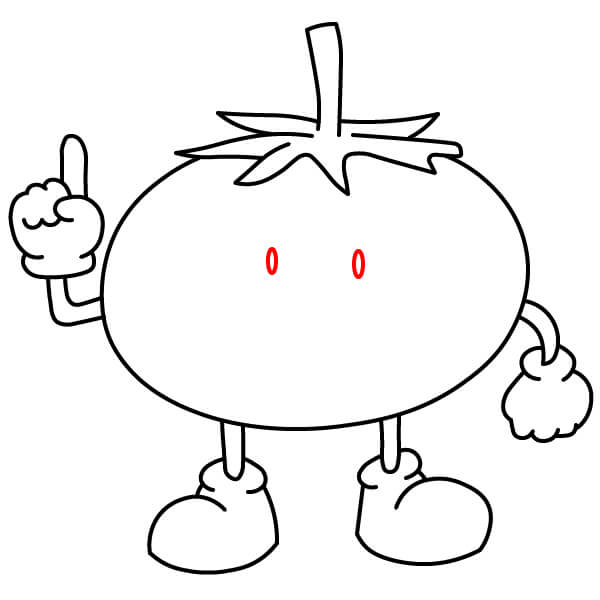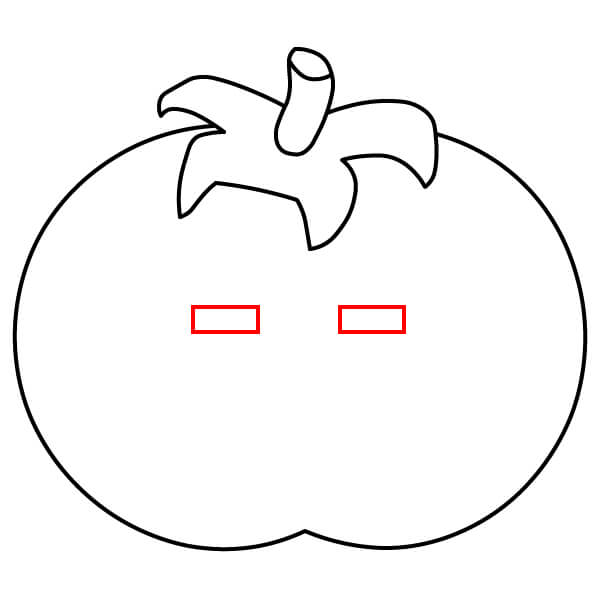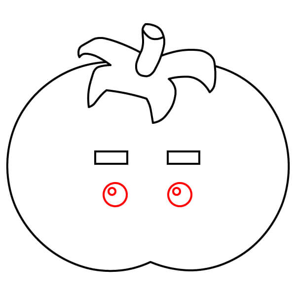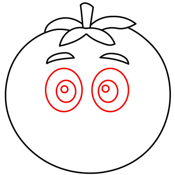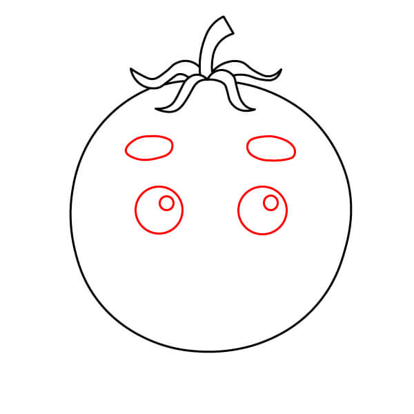 Coloriez la tomate en rouge, la tige et le calice en vert, les sourcils en noir et le contour des yeux en noir avec l’intérieur blanc.
