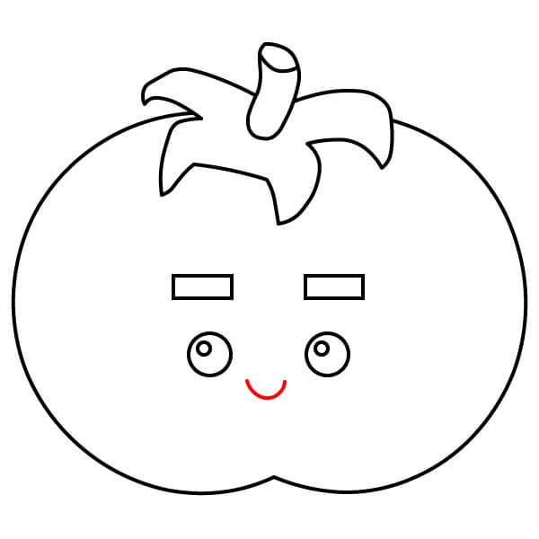 Coloriez la tomate en rouge, la tige et les feuilles en vert, les sourcils en noir, les pupilles en noir, le blanc des yeux en blanc et l’intérieur de la bouche d’un rouge plus clair.