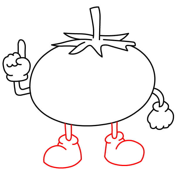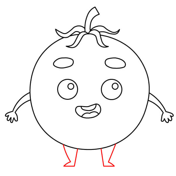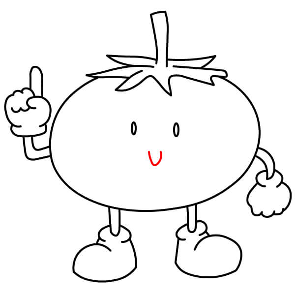 Coloriez la tomate en rouge, la tige et le calice en vert, et les bras, les jambes et les chaussures en jaune.